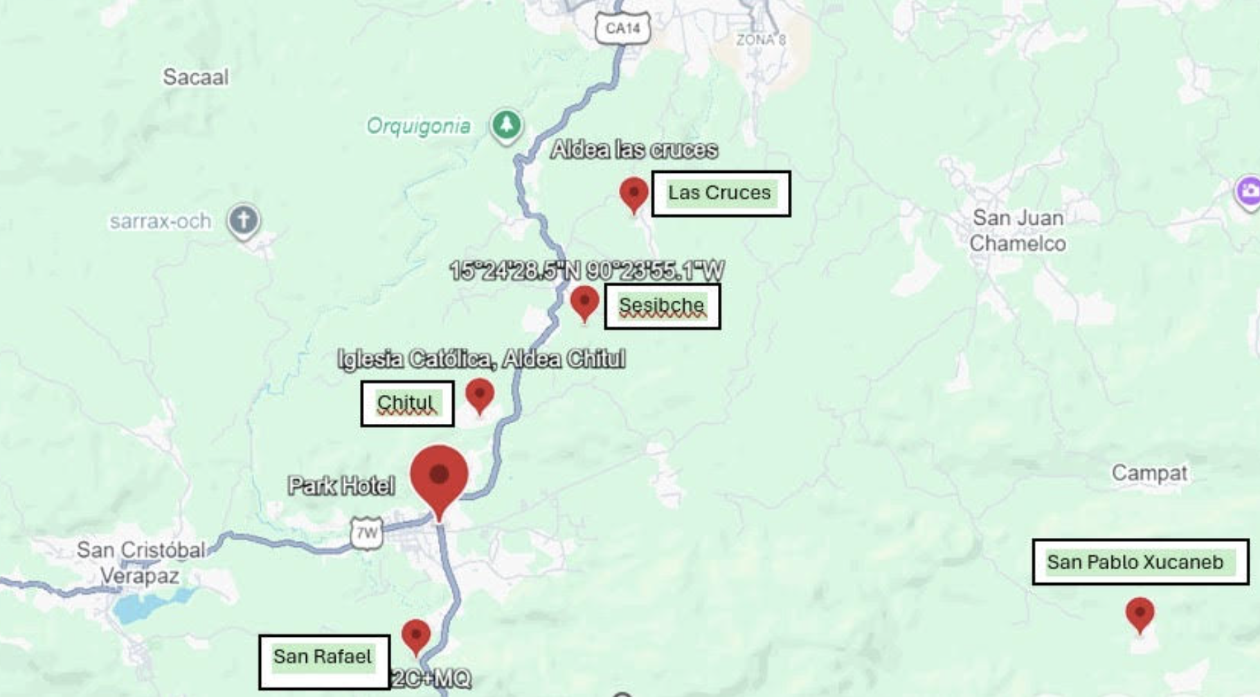 Las Cruces, Chitul, Sesibche, El Mirador, San Pablo Xucaneb, and San Rafael