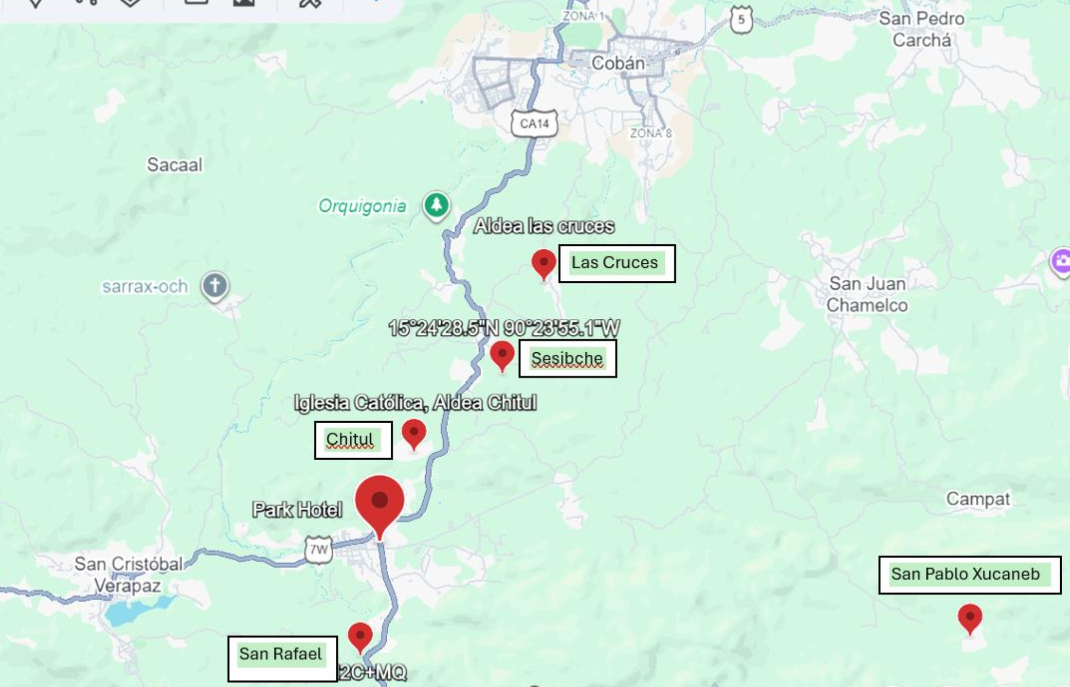 We worked in the southern villages of Manatial, San Pablo Xucaneb, and Chitul within the Alto Verapaz municipality and with our base in Santa Cruz Verapaz; a town with a population of ~21,000. San Cruz Verapaz is located approximately 17 km from Cobán, the capital of Alta Verapaz, and about 200 km from Guatemala City.